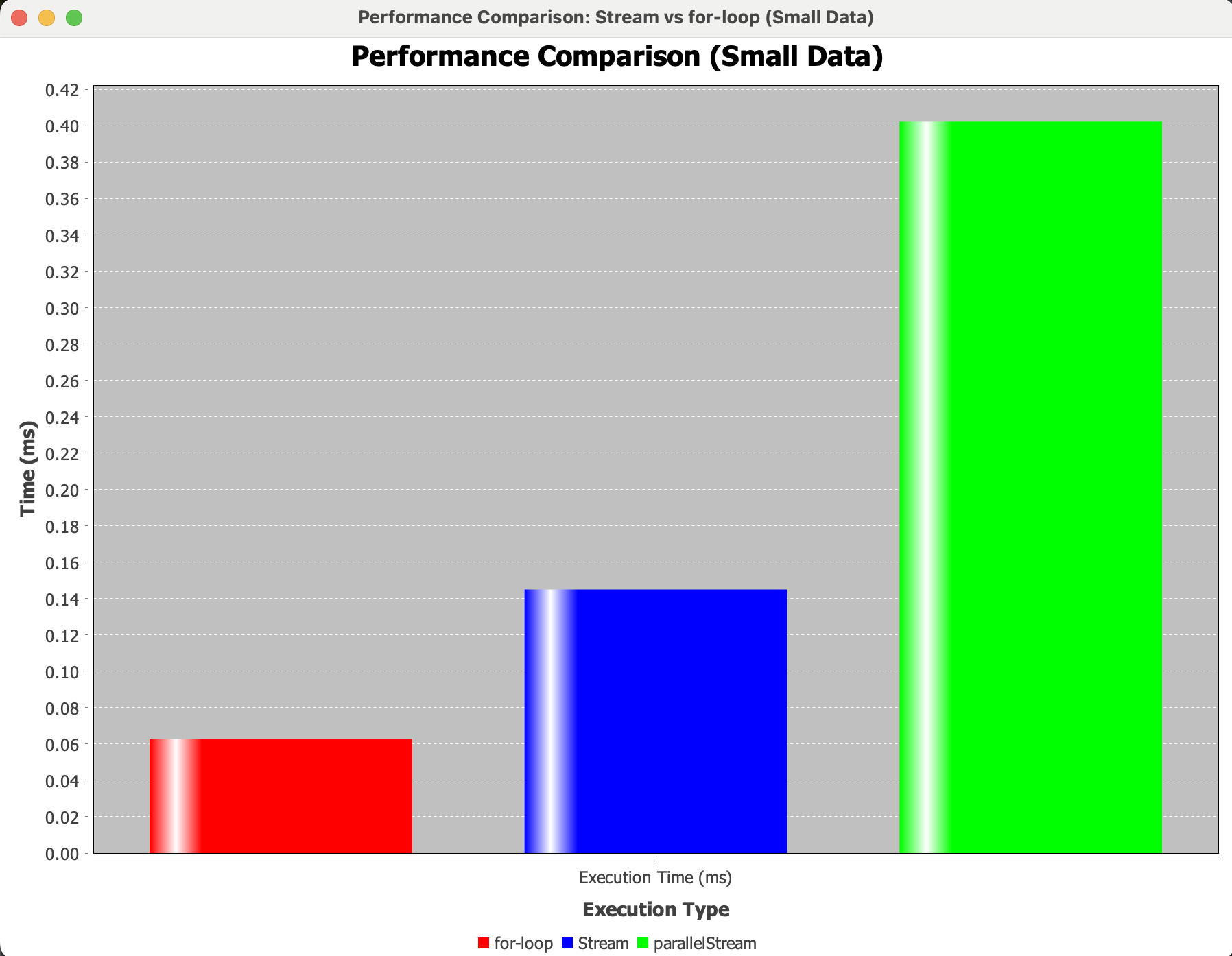 - 대량 데이터를 한 번만 반복 처리할 때는 parallelStream()이 가장 유리하다.