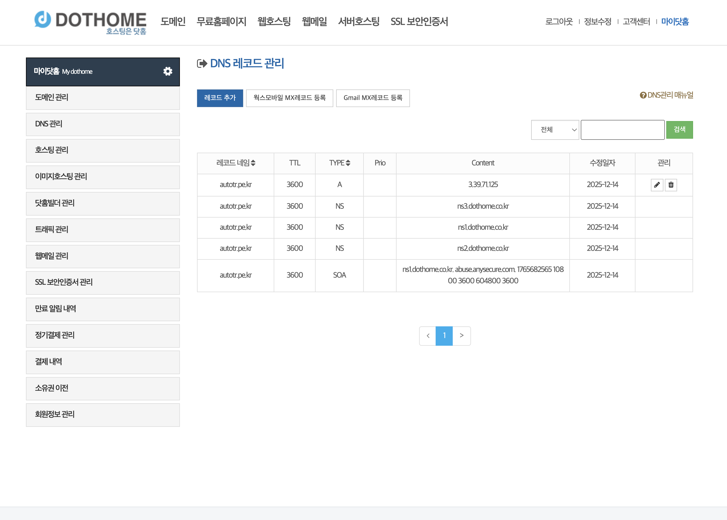 autotr.pe.kr DNS 레코드 관리 결과