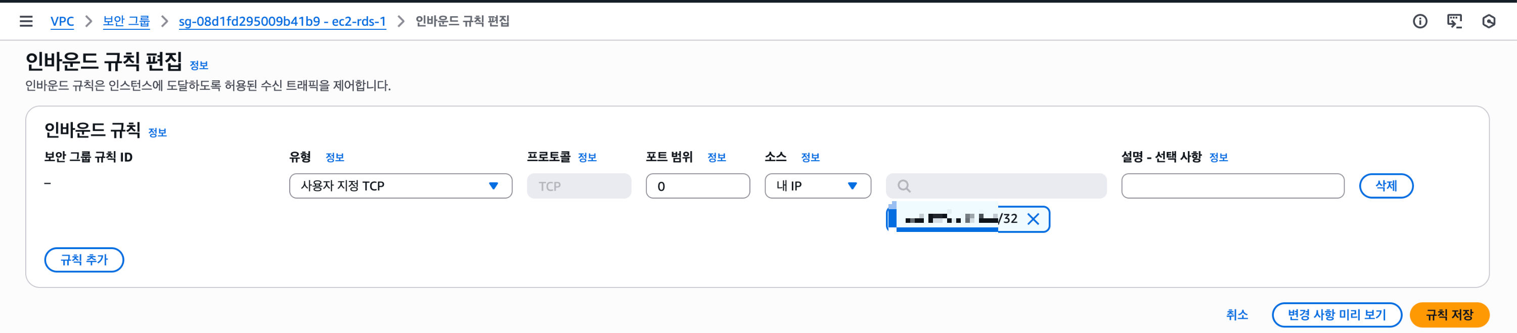 1. [1] 내 IP 확인 에서 확인한 내 IP를 작성한다. 터미널, cmd 에서 ip 확인했다면 (단일 IP 주소 하나만 정확히 대상으로 지정하기 위해서) 맨 뒤에 /32 를 작성!